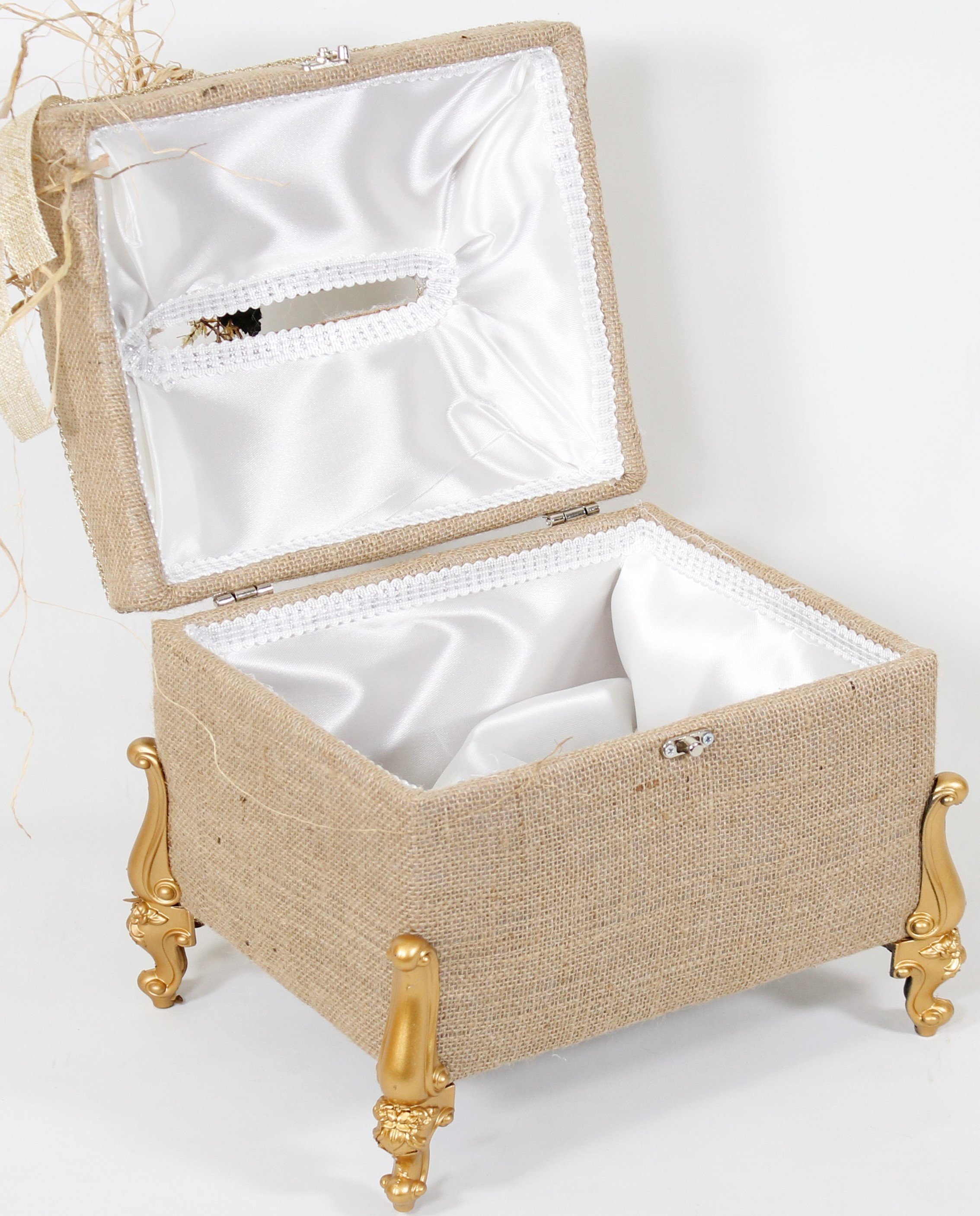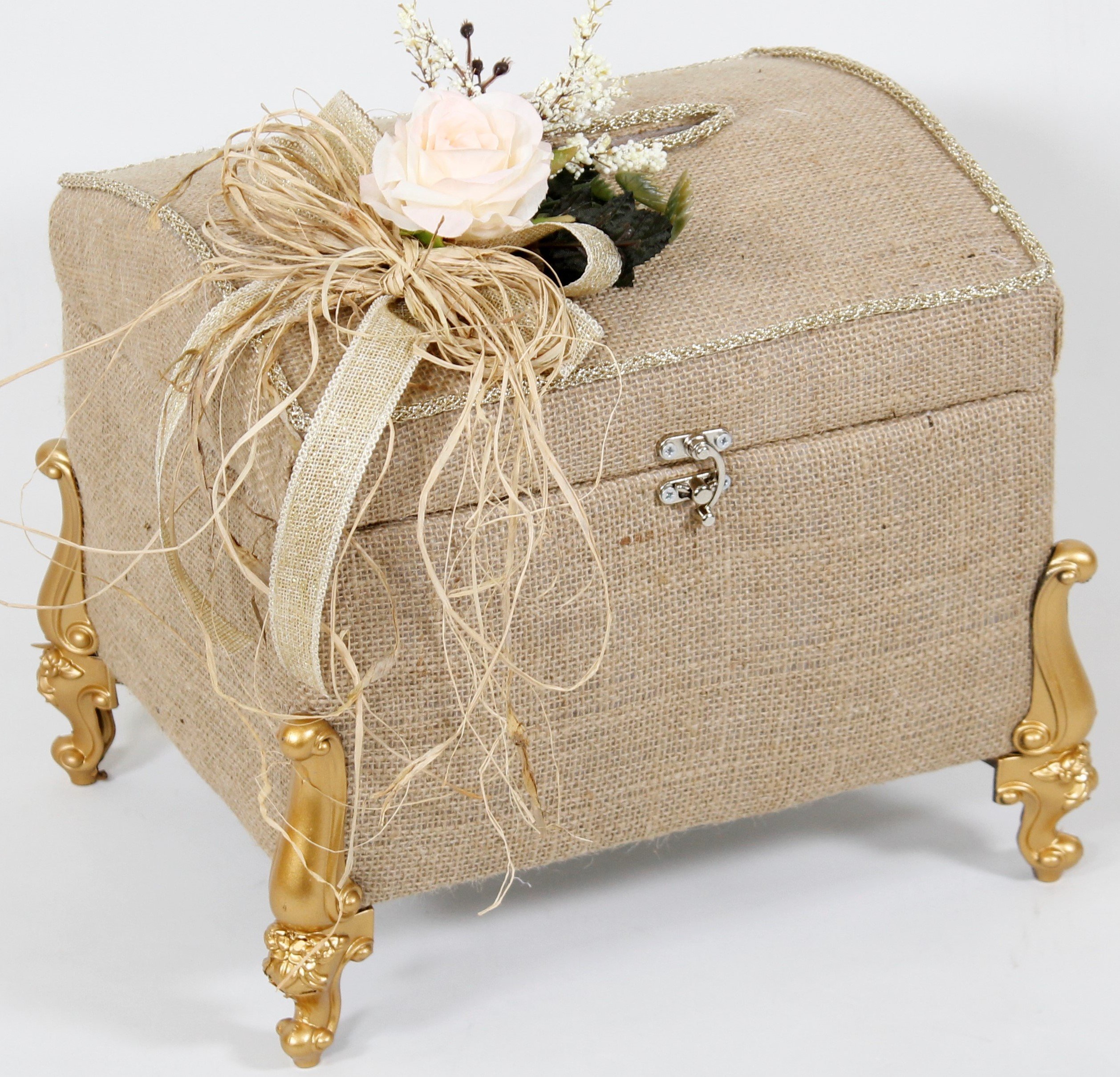 Zarf takı sandığı dışı hasır kumaş içi saten kumaş ile kaplanmıştır.Süslemede soft çiçekler kullanılmıştır,Ayrıca kancalı kilit ile sandık kapanmaktadır.ÖLÇÜ:32x22x24