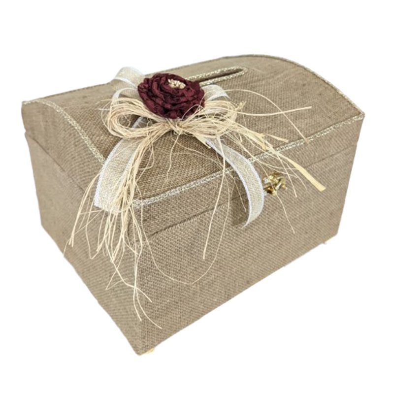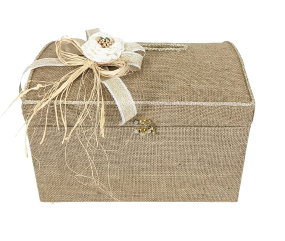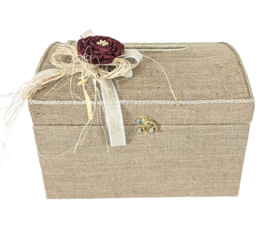 Zarf takı sandığı dışı dayanıklı hasır kumaş içi saten kumaş ile kaplanmıştır.Süslemede soft görünümlü çiçek kullanılmıştır,Ayrıca kancalı kilit ile sandık kapanmaktadır.ÖLÇÜ:30x38x26