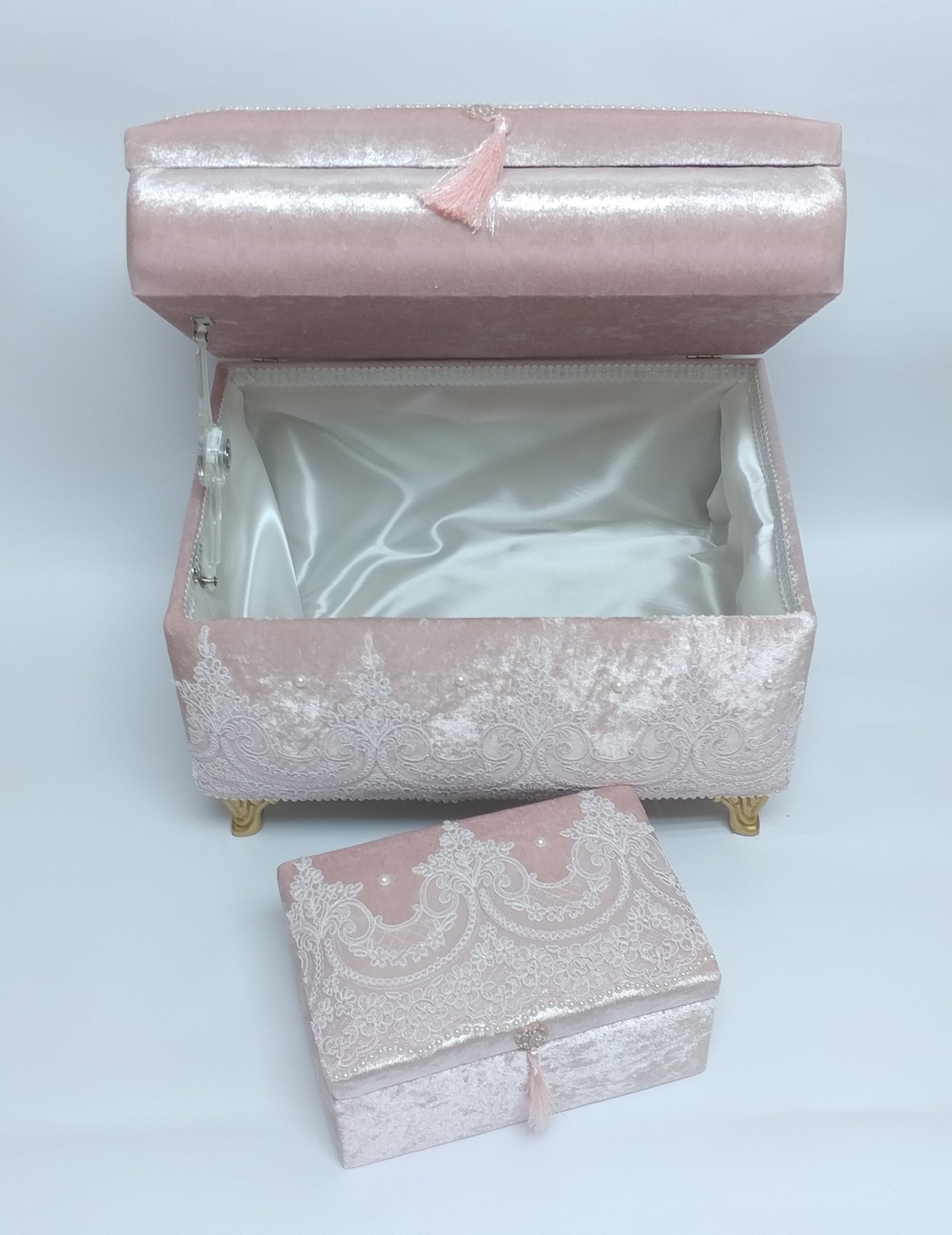 İki katlı ve içinde 1 ad makyaj sandığı mevcuttur.Dışı kadife kumaş içi saten kumaş kullanılarak kaplanmıştır.Ayrıca kadife kumaş altında sünger kullanılarak yumuşaklık sağlanmıştır.Süslemede Fransız dantel kullanılarak daha şık bir görünüm sağlanmıştır.