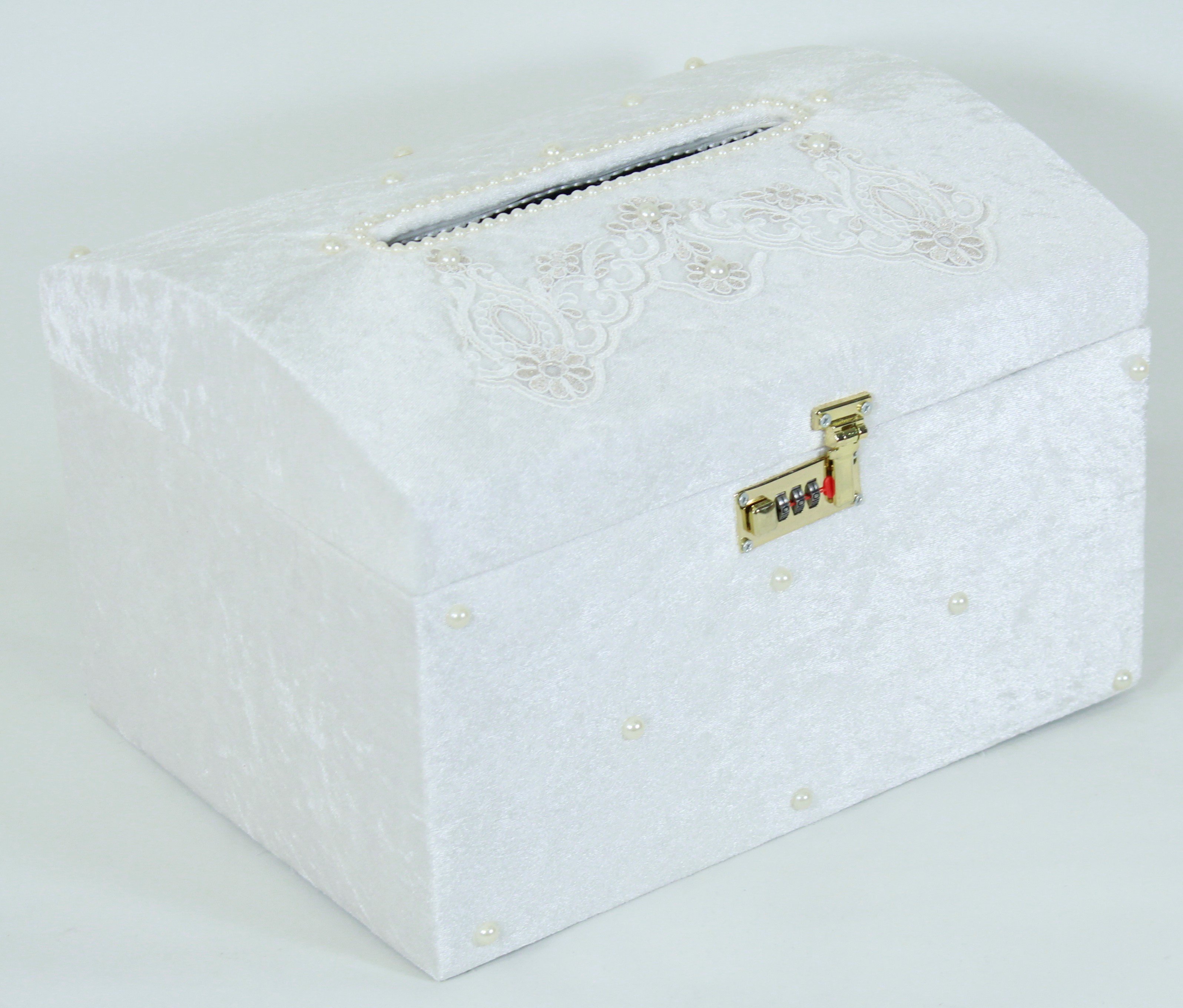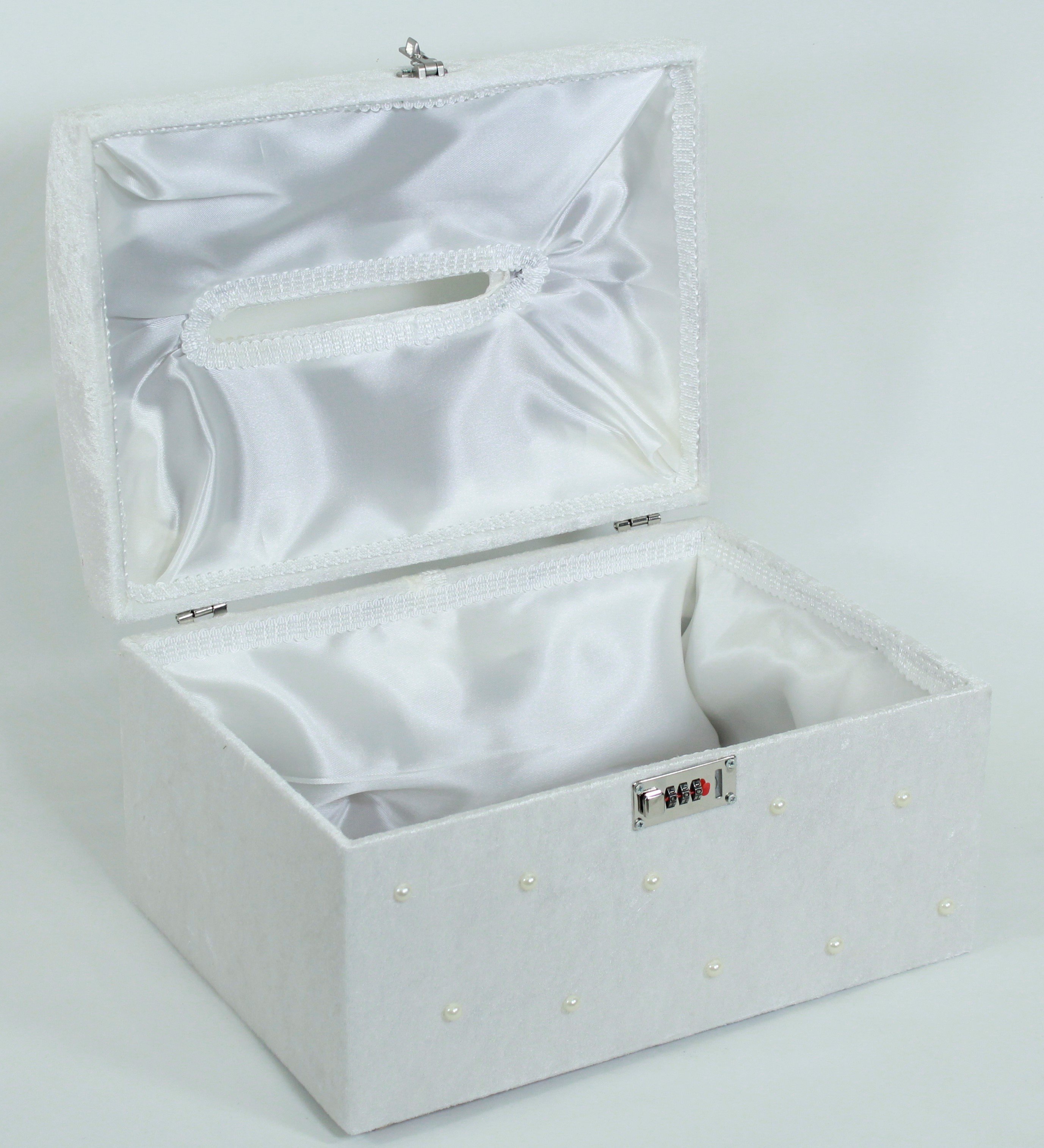 Zarf takı sandığı dışı kadife kumaş içi saten kumaş ile kaplanmıştır.Süslemede dantel ve inci kullanılmıştır,Ayrıca şifreli kilit ile sandık kapanmaktadır.ÖLÇÜ:32x22x24